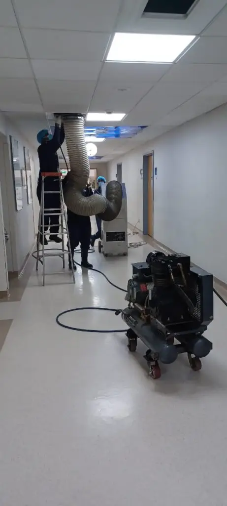 القيام بكافة الاعمال الخاصة بتنظيف وتعقيم مجاري الهواء لأنظمة التكييف، و ذلك بإستخدام أحدث المعدات و الأدوات لضمان تنظيف مجاري الهواء بشكل كامل بازالة جميع الاتربة والملوثات و البكتيريا و الميكروبات عن طريق استخدام مواد كيميائية مخصوصة لتعقيم مجاري الهواء بشكل تام.