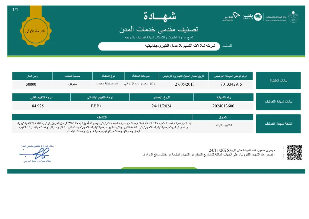 Naseem Falls is a Saudi company established in 2012 under Commercial Registration No. 2050091992. It is a sister company of Sarco (Saeed Raddad Group) and is classified as a main contractor in HVAC and refrigeration works.
